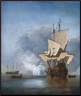 xxxxxIncidentally, the painting above - depicting the Battle of Kijkduin (also known as the Battle of Texel) - was by the Dutch marine artist Willem van de Velde the Younger (1633-1707). He came to England in 1673 and worked for Charles II, the Duke of York, and various members of the nobility for many years. His rendering of the sea is particularly realistic, whether in calm or stormy conditions, and his detailed portrayal of the ships, particularly their rigging, has proved historically valuable. There is a collection of his works in the Rijksmuseum in Amsterdam (including The Gust and The Cannon Shot, shown here), and a number of his paintings are in the National Gallery and the Wallace Collection in London. ……