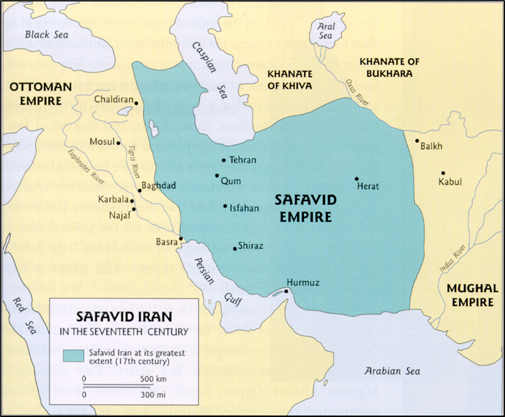 Abbas I: detail of fresco, date and artist unknown – the Pavilion of Chehel Sotoun, Isfahan, Iran. Map (Safavid Empire): licensed under Creative Commons – https://common wikimedia.com. Masjid-