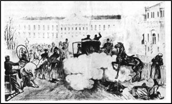xxxxxIncidentally, attempts to assassinate Tsar Alexander II, beginning in 1866, included a number of shootings, the derailing of his train, and the blowing up of the Winter Palace in St. Petersburg. He was eventually killed in 1881 by a bomb which was thrown into his carriage by a member of a revolutionary organisation known as “The People’s Will” (illustrated). This was a break-away movement from Narodnism (Populism), an organisation whose middle class members argued that the freed serfs were being sold into “wage slavery”. Active during the 1860s and 1870s, the main aim of its members, the Narodniks, was to convert the peasantry to a modified form of communism. But they found it difficult to relate to the peasants, were constantly hounded by the secret police, and were almost obliterated when their revolt of 1877 was brutally crushed. However, their ideas survived, and helped to pave the way for the Russian revolutions of 1905 and 1917.