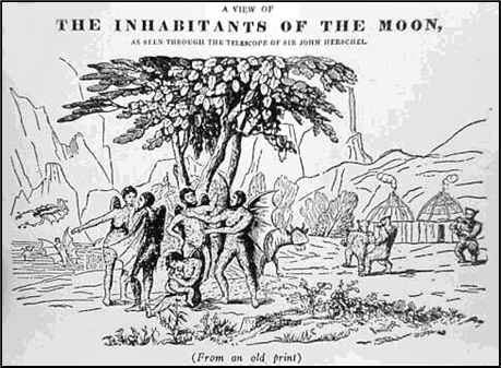 “Edinburgh Journal of Science” (which was no longer in existence!) describing life on the moon as seen by Herschel through his “revolutionary” telescope. The instalments gave a vivid account of the lunar landscape, its craters, vegetation and strange animals, and then went on to describe the moon “people” themselves, furry men and women who looked like bats and could fly like them! When Herschel finally heard of the hoax, he took it in good part, but complained that he had been pestered by journalists and others from all over Europe!