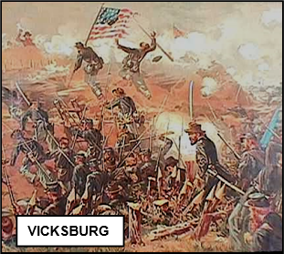 xxxxxThe Confederate army won The First Battle of Bull Run in June 1861 (Va), and gained a further victory at the Second Battle of Bull Run in August 1862. An attempt the following month to seize the Union capital, Washington, ended in a defeat for the Southerners at the Battle of Antietam, but they gained another major victory at the Battle of Fredericksburg before the winter set in. Meanwhile in the west the Union forces proved much more successful under General Ulysses Grant. They seized Confederate strongholds in Tennessee, and won the Battle of Shiloh in April 1862. By June, Memphis, Corinth and New Orleans had been taken, and Grant’s victory at the Battle of Vicksburg meant that the Confederation had been split down the middle, north to south. The resumption of fighting in the east in April 1863 led to a Unionist defeat at the Battle of Chancellorsville, Virginia, but, as we shall see, the Unionists were to win a decisive victory at the Battle of Gettysburg in Pennsylvania in July 1863. The War at Sea centred around the Union blockade of southern ports, and this proved generally successful. The major event of the conflict was the battle between the two warships, the Unionist Monitor and the Confederate Virginia, in January 1862. It proved inconclusive, but it was the first naval battle to be fought between ironclads.