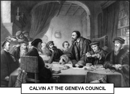 xxxxxThe French church reformer John Calvin was a guiding spirit of the Reformation. In 1541 he established a puritan community in Geneva which adhered to a strict moral code in dress, personal behaviour and pious living. But whilst gambling, plays, dancing and the like were banned, improvements were made in education and the care of the sick, and a semblance of representative government was introduced. He began his major work, Institutes of the Christian Religion, in 1536. Revised many times, this called for a return to the purity and vitality of the Early Church. And it was here that he reiterated his doctrine of predestination whereby a Christian's fate was already predetermined by God. The Presbyterian Church he established was a blueprint for protestants throughout Europe, and no where more so than in Scotland, where, as we shall see (1560 L1), John Knox became the leading Calvinist.