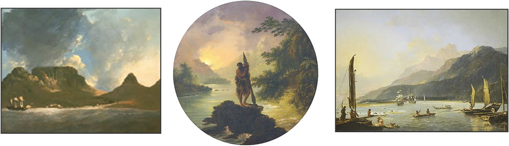 xxxxxIn August 1768, as lieutenant in charge of the Endeavour, a sturdy Whitby collier, he was given command of a scientific expedition to Tahiti in the South Pacific to observe Venus eclipsing the Sun, a rare phenomenon. Organised by the Royal Society, he had on board some artists, an astronomer (Charles Green), and two botanists, Joseph Banks and Daniel Solander. Having reached Tahiti (illustrated) and successfully witnessed the eclipse in June 1769, he then set out to find Terra Australis Incognita, an unknown continent thought to be situated further south. He passed through the Society Islands and then, sailing southwards, sighted New Zealand, first discovered by the Dutch navigator Abel Tasman in 1642. He spent several months surveying both islands, chartering and mapping some 2,400 miles of coastline and making a number of landings, the first being at Poverty Bay on the east coast of North Island where the Maoris were somewhat hostile.