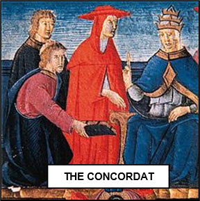 xxxxxAs far as the Holy Roman Empire was concerned, the matter was finally resolved by a compromise agreed between Henry V (illustrated left) and Pope Callixtus II (illustrated right) in 1119. Both parties were anxious for a settlement, but especially the Emperor, who faced widespread unrest at home. The final agreement was issued at the Diet or Council of Worms in 1122 and was called a Concordat, the first true example of a formal agreement between the Roman Catholic Church and a sovereign state. By it, Henry gave up his right to invest bishops with the symbols of office -