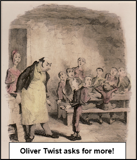 xxxxxDicken’sxnovels were much enhanced by the quality of their illustrations. The picture of Oliver Twist above, asking for more, is an illustration (here coloured) by George Cruikshank, and he also did drawings for Sketches by Boz. His fellow artist John Leech (1817-