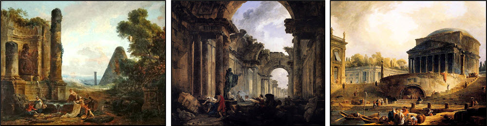 xxxxxOn returning to Paris in 1765, he became a member of the French Royal Academy the following year, and popularised his landscapes by a series of exhibitions. Later his work included Roman remains in the south of France - such as the Pont du Gard in 1787 (illustrated above) - and views in and around Paris. These included some of Versailles, where, as a landscape architect, he also introduced picturesque ruins and grottoes for the gardens at the Petit Trianon. His paintings sold well, but like many artists at this time, his career was badly affected by the outbreak of the French Revolution. He was imprisoned for a time, but in the 1790s he did work with Fragonard on some work for the Musée Français in the Louvre, and this included his Imaginary View of the Grande Galerie of the Louvre in Ruins, painted around 1796 (illustrated centre below). A talented artist, like Fragonard, his death went virtually unnoticed. Illustrated below (left and right) are two views of ancient Rome.