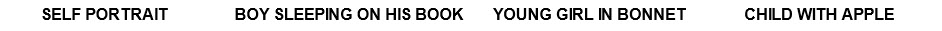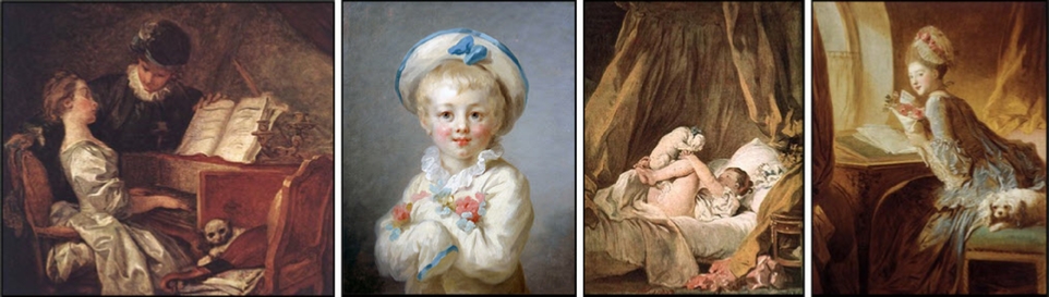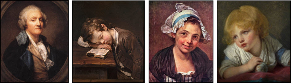 Fragonard: Young girl reading a book – National Gallery of Art, Washington; The Abbé de Saint-Non (Inspiration) – The Louvre, Paris; The Swing – Wallace Collection, London; The Music Lesson – The Louvre, Paris; Boy dressed as Pierrot – Wallace Collection, London; Girl with Dog – Alte Pinakothek, Munich; The Love Letter - Metropolitan Museum of Art, New York. Robert: Le Pont du Gard – The Louvre, Paris; The Fountain of Minerva, Musée des Beaux Art, Angers, France; Imaginary View of the Grand Gallery of the Louvre in Ruins – The Louvre, Paris; View of Ripetta – École Nationale Supérior des Beaux Arts, Paris. Greuze: The Laundress – Getty Centre, Los Angeles, CA; Self-Portrait – The Louvre, Paris; Boy sleeping on his book – Musée Fabre, Montpelier, France; Young Girl in Bonnet – Hermitage Museum, St. Petersburg; Child with apple – National Gallery, London.