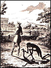 xxxxxAnother Faust-like story at this time was the prose fantasy written by the French-born German romantic poet Adelbert von Chamisso (1781-1838). Entitled Peter Schlemihl’s Remarkable Story, and published in 1814, it told the tale of a man who sold his shadow to the devil in exchange for wealth and prestige (illustrated below). But being without a shadow soon landed him in some unexpected trouble. However, he refused to give away his soul for the return of the shadow, and, with the aid of a huge pair of boots, he is reduced to wandering around the world looking for his lost peace of mind. This supernatural theme caught the imagination of the public and it became a classic of German romantic fiction.