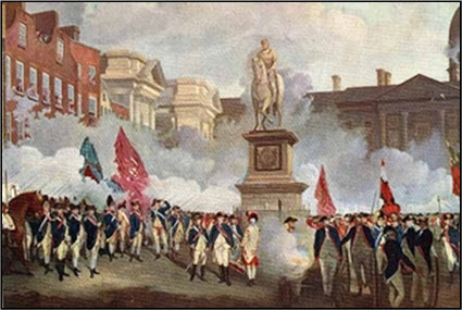 xxxxxThe severe measures introduced against Irish commerce and industry at that time - such as the banning of the export of Irish food stuffs to England, and a total ban on the trade in woolens - led to the steady economic decline of Ireland. These measures angered the Protestants, as did the restraints placed on their law making. It is not surprising, therefore, that the outbreak of the War of American Independence in 1775 should strike a chord in Ireland. It also provided an opportunity for action. Needing all the troops they could muster, the British withdrew their garrison of 4,000 troops from Ireland, and the Dublin government was obliged to raise a force of Protestant volunteers - some 40,000 strong - to protect the coastline from American privateers and a possible French invasion. It escaped no one’s notice that, given the opportunity, this militia could also be used to promote a more pressing cause - greater independence for Ireland! (Illustrated here is a muster of the Irish Volunteers in College Green, Dublin, November 1779.)