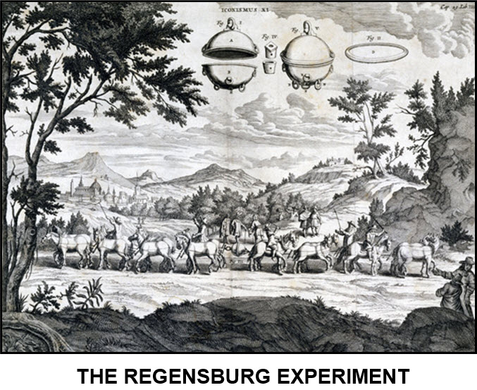xxxxxThen in 1654, to demonstrate in dramatic form the incredible force that outside air pressure exerted on a vacuum, Guericke set up an extraordinary public experiment at Regensburg in the presence of Emperor Ferdinand III. He fitted two metal hemispheres (hollow half-globes) tightly together - making a globe about 14 inches in diameter - and pumped out the air. He then harnessed a team of eight horses to each hemisphere and attempted to pull them apart. The sixteen horses failed to do so! However, once air was pumped into the globe, the two sides fell apart. This brilliant piece of showmanship - later to become known as the "Magdeburg Hemispheres" - was one of the most spectacular experiments in the early history of science.