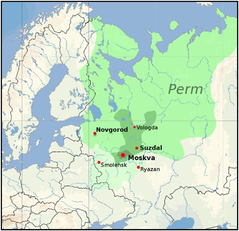 Dmitry Donskoy: statue in the centre of Dzerzhinsky, in the outskirts of Moscow. Ivan III: portrait from an illuminated manuscript from the 17th century Tsarskiy Titulyarnik (Tsar’s Book of Titles), artist unknown – Hermitage Museum, St. Petersburg. Map (Russia): by courtesy of the Copyright Holder David Liuzzo – en.wikipedia.org.