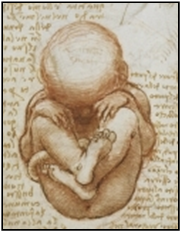 artistic drawings, some 600 of which are housed in the royal library at Windsor Castle. His brilliant drawings of humans, animals and plants testify to his remarkable powers of observation, whilst his anatomical illustrations were accurately based on his own experience at the dissecting table (as seen in this drawing of a foetus). He also made sketches illustrating various types of what are today known as “contact lenses”. Prime examples of his draughtsmanship are his cartoon for the Battle of Anghiari -