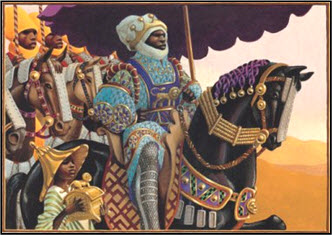 xxxxxBy this time, such abundant wealth had created a huge empire in the western Sahara, occupying an area comprising modern Senegal, Gambia, Mali and southern Mauritania. It formed, in fact, one of the largest empires of the day. And even while Mansa Musa (illustrated) was on his travels, his territory was extended further by the conquest of the Songhai Empire and the capture of its capital Gao on the southern edge of the Sahara. In this city and the nearby centre of Timbuktu the Mali leader had magnificent mosques built. And it was under his guidance that Timbuktu became a great centre for Muslim learning and culture as well as a commercial metropolis on the caravan routes across the Sahara.