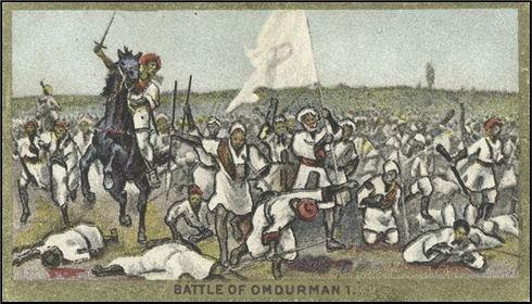 xxxxxFollowing this encounter, fought in April 1898, the Anglo-Egyptian army marched and sailed on towards what proved to be the decisive battle. By the end of August it had reached the plain in front of Omdurman, a town on the Nile, just north of Khartoum. Without delay and with little regard for the consequences, the Sudanese warriors - known in the West as “Dervishes” - then launched a frontal attack upon the invading force on the 2nd September (illustrated). As in earlier battles these tribesmen - armed with spears or outdated rifles - proved no match for the modern firepower of their enemy. Few if any got to within striking distance of their foe, blown up by the artillery or mown down by accurate fire from rifle or machine gun. Of the 50,000 taking part in the attack it is estimated that one fifth were killed. Anglo-Egyptian losses were put at 48 dead and fewer than 400 wounded.