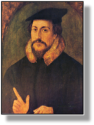 movement got under way in Zurich, led by the energetic Ulrich Zwingli (illustrated right). Under his leadership, virtually all the elements of the Roman Catholic Church were abolished, including the Mass. Berne and Basel followed suite, but the five forest cantons remained loyal to the Pope and in the ensuing civil war Zwingli was killed. Thus Switzerland remained divided, as it is today, with the Protestants situated mostly in the lowland and larger cities. As we shall see, a generation later (1536) came the French theologian John Calvin (illustrated left). His theocracy in Geneva (1541-