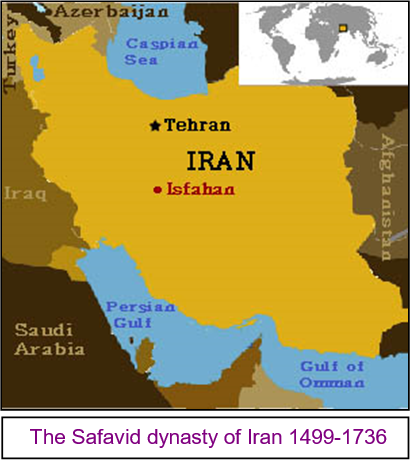 xxxxxAs we have seen, in 1499 (H7) Shah Ismail I founded the Safavid dynasty, and he was in control of most of Iran by 1512. The Safavids were defeated by the Ottoman Turks two years later, but early in the 17th century Shah Abbas captured Baghdad and a large part of eastern Iraq, extending his empire from the Tigris to the Indus. Iran then developed into an important trading nation centred around Esfahan. But his successors failed to guard the empire against infiltrators. Eventually one of the empire’s own subjects, having seized the throne of Afghanistan, invaded Iran in 1722, overthrew Sultan Husayn, and all but brought down the Safavid dynasty. At the same time Peter the Great occupied most of northern Iran and the Turks moved in from the west. As we shall see (1739 G2), it was not until 1736 that the country was reunited under Nadir Shah and a new empire was built.