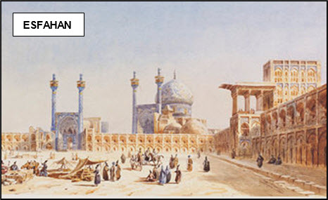 Map (Iran): licensed under Creative Commons – worldhistorykc.wikispaces.com/Muslim+Empires. Esfahan: watercolour by the French artist Eugène Flandin (1809-
