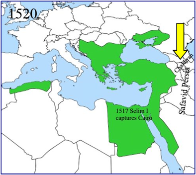 xxxxxAs we have seen, the capture of Constantinople by the Ottoman Turks in 1453 (H6) was but a step towards further expansion. Mehmed II made further conquests in 1468 (E4), and at his death in 1481 the empire covered most of Anatolia and the Balkans. When Selim I came to power in 1512 he attacked the Safavid dynasty, defeating their leader at the Battle of Chaldiran in 1514. He then rounded on the Mamluks, gaining victories over them in Syria, at the Battle of Marj Dabiq, and then in Egypt at the Battle of Raydaniyah, near Cairo, in 1517. By then he was recognised as the leader of the Islamic world, holding sway over Egypt, Syria, Palestine and the Lebanon. As we shall see (1526), his successor, Suleyman “the Magnificent” was to bring the Empire to the height of its power.