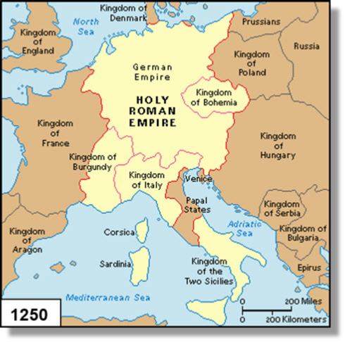 xxxxxBut the Pope's opposition to Frederick was hardly surprising. The Emperor was bent on bringing both Sicily and Italy within his empire and this meant an almost constant battle with the Papal States and the city states of northern Italy, united in the Lombard League. These Italian wars placed an enormous strain on the Empire. Quite apart from the financial burden they imposed, they led to serious unrest within Germany, and for some years Frederick's right to the throne was challenged. When he died suddenly in 1250, such had been his impact on the affairs of the time, that many would not accept his death and believed that he had been hidden away in a volcano or some mountain cave, destined to return and save the Empire in a future hour of need!
