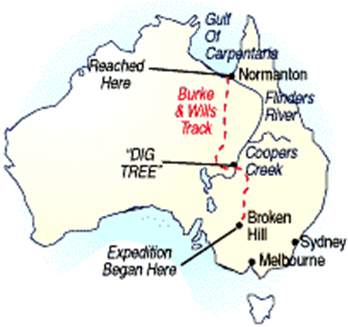 xxxxxMuch of the blame for the deaths of these three men, plus others of the party, has been attributed to Burke’s lack of experience and his unwillingness to take advice from others or seek the assistance of the Aboriginals, particularly on the return journey. The expedition itself, made up of 18 officers and men, 26 camels and sufficient food supplies for two years, was more than adequately equipped, but Burke’s decision to complete half the journey with just three other men, advancing well ahead of the support party, proved a recipe for disaster.