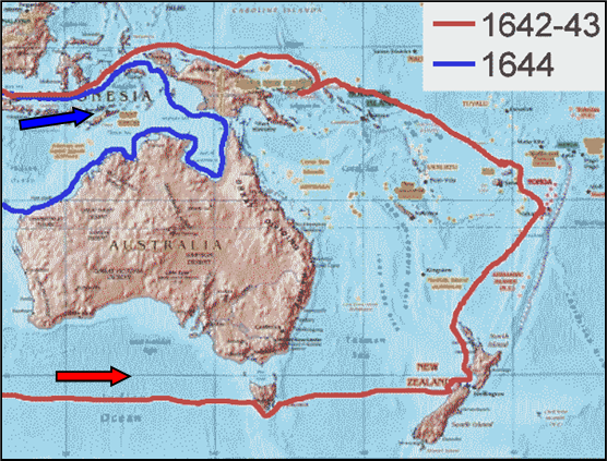 xxxxxAs we have seen, it was in 1606 (J1) that the Spanish explorer Luis Vaez de Torres sailed between New Guinea and Australia, and the Dutchman Willem Jansz explored the western side of the Cape York peninsula. In 1642 another Dutch navigator, Abel Tasman, travelled along the southern coast of Australia, though he didn’t sight land until he reached Tasmania. He named it Van Diemen's Land and then, travelling further east, he landed on the southern island of New Zealand before going on to discover the islands of Tonga and Fiji. In a second expedition, two years later, he explored the north coast of Australia and discovered the Gulf of Carpentaria. His voyages likely proved that the great “South Land” (Australia) was, indeed, a vast island. Later Van Diemen’s Land and the sea in this area were named after him.