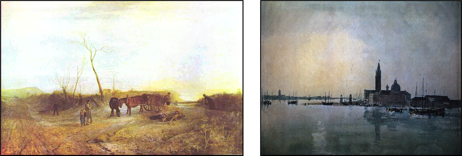 xxxxxJoseph Mallord William Turner was one of England’s greatest and most original landscape artists. He attended the Royal Academy school and then, together with his friend and rival Thomas Girtin, studied at the academy run by the art collector Thomas Monro. At first he painted picturesque landscapes to make a good living, but his abiding love of water and boats also produced an array of brilliant sea pieces, ranging from the serene to the tempestuous. His style was mainly influenced by the works of Cozens, Canaletto, Claude Lorrain and Richard Wilson. He travelled widely to find worthy subjects, and his visits abroad introduced him to the purity of Italy’s natural light, and the beauty of Venice. As we shall see (1838 Va), he then began to experiment with a new method of reproducing the effects of light and this, together with his daring use of colour and free brushwork, were to produce the masterpieces of his later years. His major works in this early period included Tintern Abbey (1795), Calais Pier (1803), Frosty Morning (1813), Crossing the Brook (1815), Snowstorm: Hannibal crossing the Alps (1812) and The Bay of Baiae (1823).