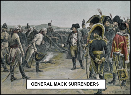 xxxxxFollowing the outbreak of the Napoleonic Wars in 1803, Napoleon was faced with the Third Coalition, made up of Britain, Austria, Russia and Sweden. In 1805 Austria, without waiting to join up with the Russian army, invaded Bavaria, secure in the knowledge that Napoleon’s major force was stationed at Boulogne, preparing to invade England. However, by a series of forced marches, Napoleon led his Grand Army into Germany and, taking the Austrian army by surprise, drove it into the city of Ulm in October 1805. Here, surrounded, outnumbered and with the Russians still some 100 miles distant, its commander, General Karl Mack, was forced to surrender. As we shall see, this victory paved the way for the French occupation of Vienna, and Napoleon’s triumph at the Battle of Austerlitz in December 1805.