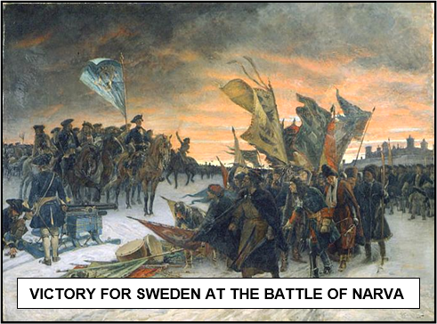 xxxxxA golden opportunity to cut Sweden down to size and put an end to her control of the Baltic came in 1697 when Charles XII, a mere lad of 15 years of age, came to the Swedish throne. In 1700 an alliance formed between Russia, Saxony-Poland, and Denmark-Norway went on the offensive. In February, Saxon troops invaded Livonia in the opening campaign of what came to be known as the Great Northern War. But the coalition had not reckoned with the courage and ability inherent in the young Charles XII, destined to be one of Sweden's greatest monarchs. With the help of his senior officers, he mounted a daring counter offensive in the August. Ferryingxhis troops across the Baltic, he seized Zealand, drove the Danes back, and enforced the neutrality of their king, Frederick IV, at the Peace of Tavendal (now Traventhal). Then barely three months later he turned on the Russians, then laying siege to the city of Narva, and, though heavily outnumbered, virtually destroyed their entire army at The Battle of Narva. Fought in a blinding snowstorm, we are told that the Russian leader, Tsar Peter I, fled from the battlefield crying like a child and determined on revenge.