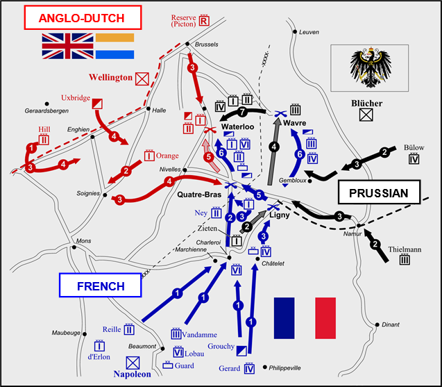 xxxxxNapoleon’s defeat at the Battle of Waterloo is more often than not put down to the fact that he delayed his opening attack until close on midday. Certainly this postponement gave Blücher the time he needed to march to Waterloo. Two of his corps reached the battlefield during the afternoon, and played a vital if not decisive part in the fighting, and Blücher himself arrived early in the evening and ensured an Allied victory. Some historians claim that Napoleon blundered by deciding to give time for the ground to dry out after the heavy overnight rain; others that he saw no immediate danger from the Prussians and thought he had time enough to deal with Wellington, that 3rd-rate “Sepoy General”. It is worth noting, however, that when he did launch his attack, his infantry and cavalry had difficulty in crossing the muddy terrain, and some of his artillery became bogged down. If he had made his assault four or five hours earlier the condition of the ground would have been appreciably worse and the attack may well have ended in total disaster.