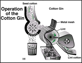 xxxxxThexfollowing year (1793), in partnership with the plantation’s manager Phineas Miller (1764-1803), he built the first of his cotton gins. Devised to separate the short-staple fibre from its seeds - until then done tediously by hand - it proved capable of producing some 50lbs of cleaned cotton a day. Housed within a box, it consisted of a series of spiked teeth mounted on a revolving cylinder. When this was turned by a handle or crank, the cotton fibre was pulled through a fixed comb, thereby detaching the seeds from the lint. At the same time, a rotating brush, turning in the opposite direction, brushed the fibrous lint